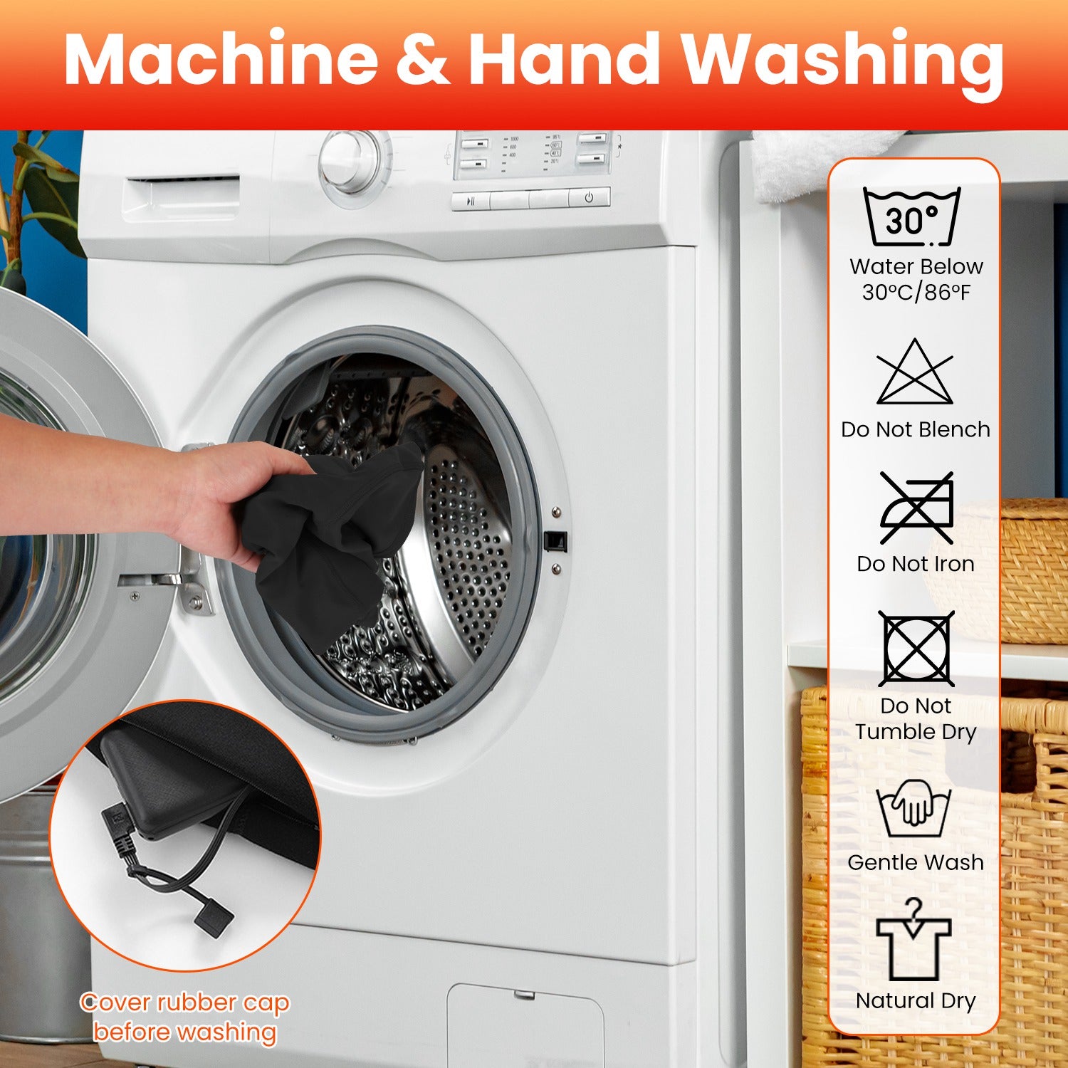 *Machine Washable*:Hassle-free maintenance!Easily unplug the power cable,cover the rubber cap and throw the pants into washing machine. After washing,dry it in a well-ventilated place exposed to sunlight. Please make sure the water temperature remains below 30°C/86°F. Do not tumble dry,iron,blench.
